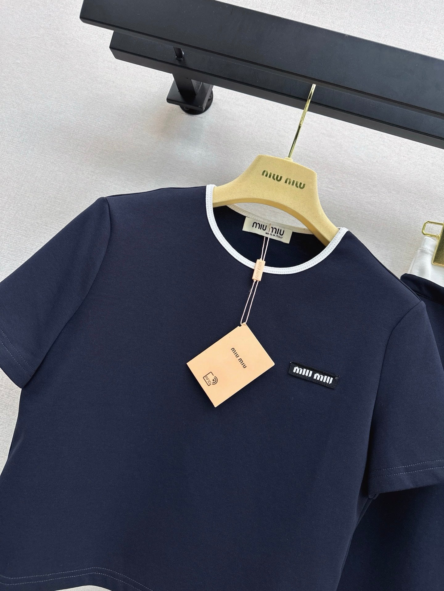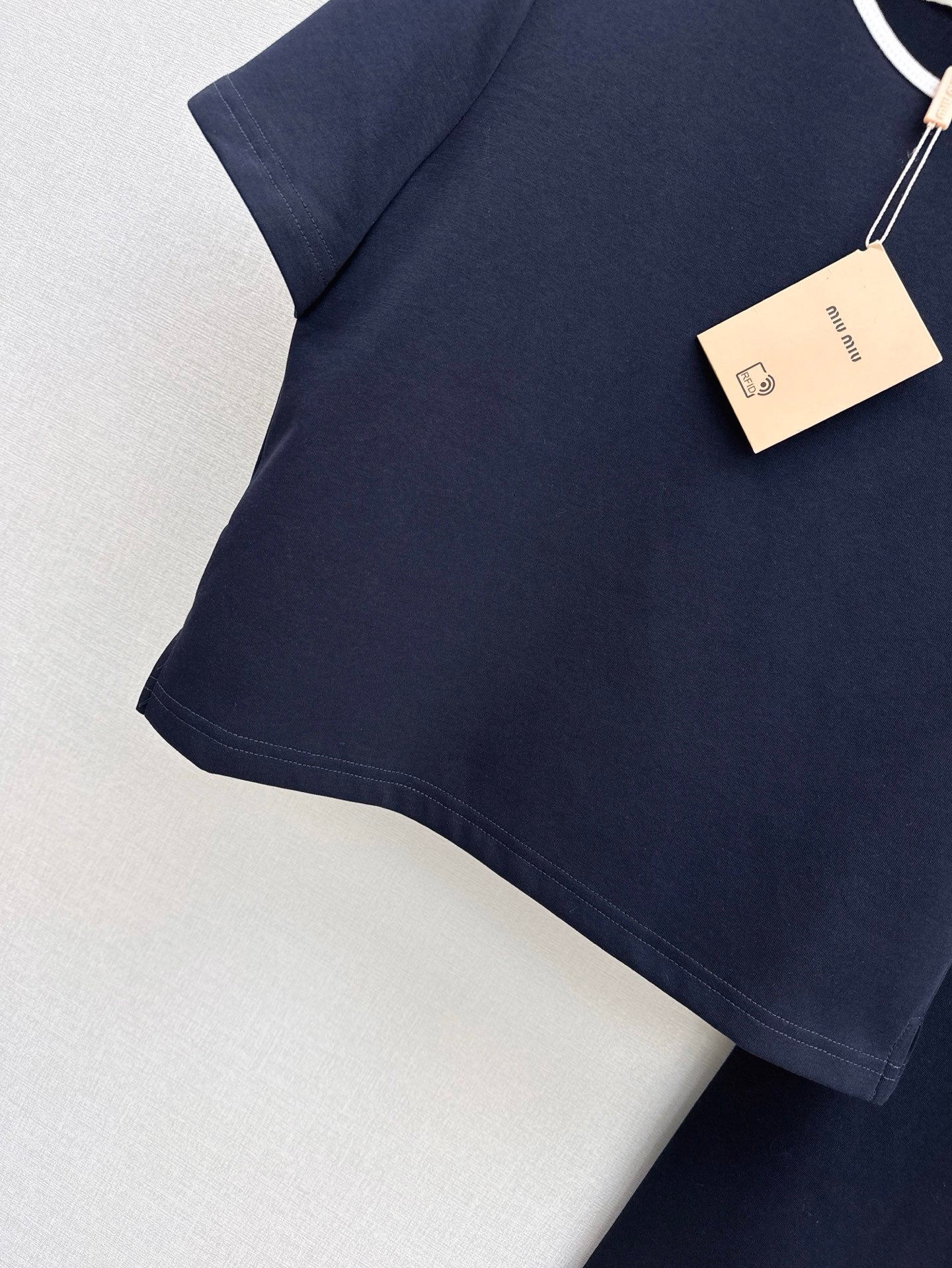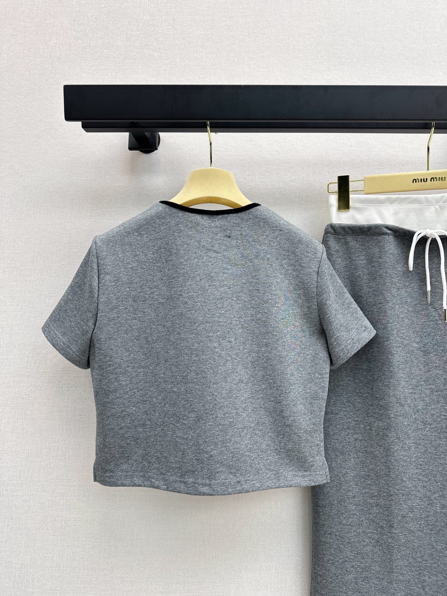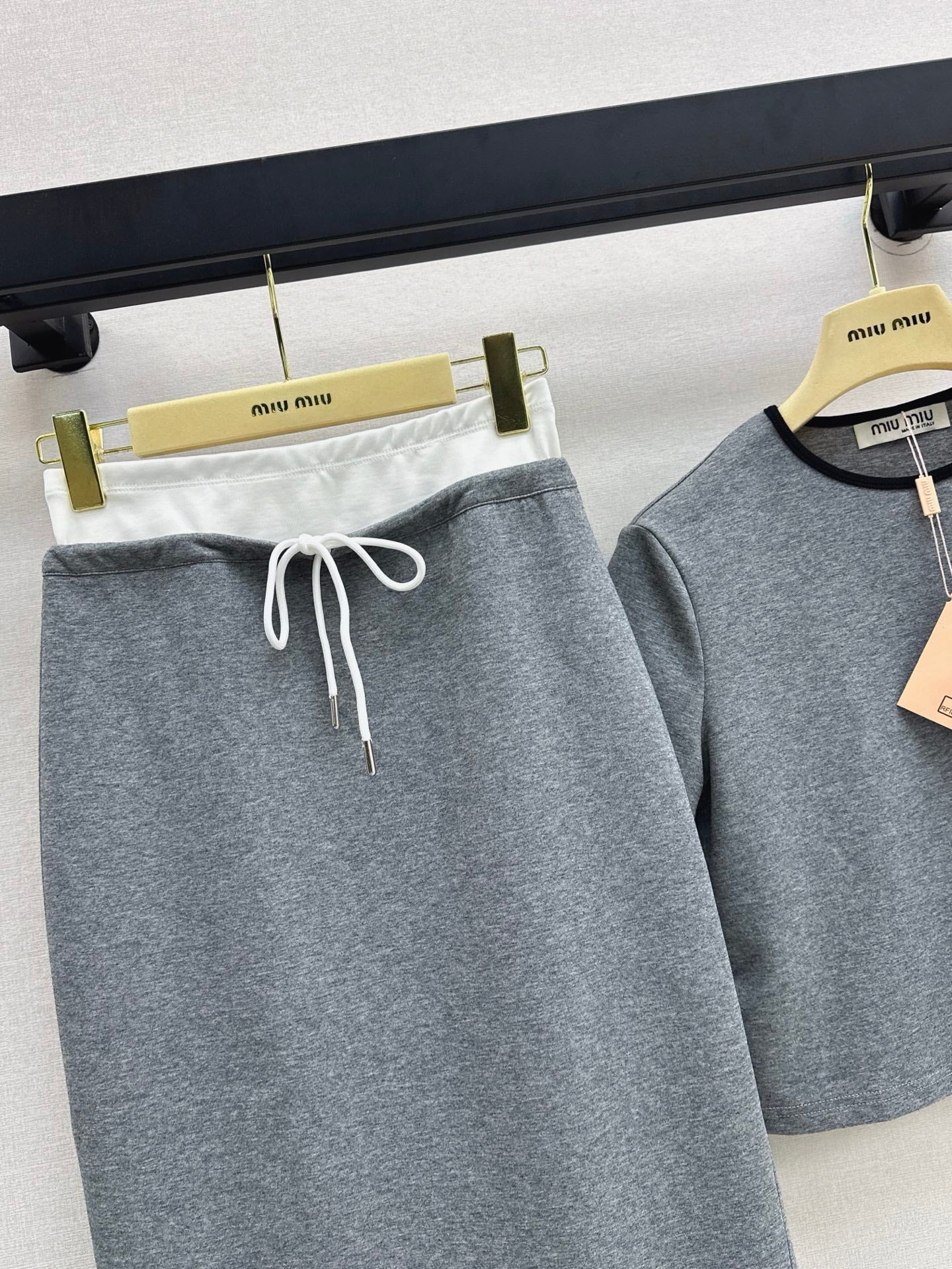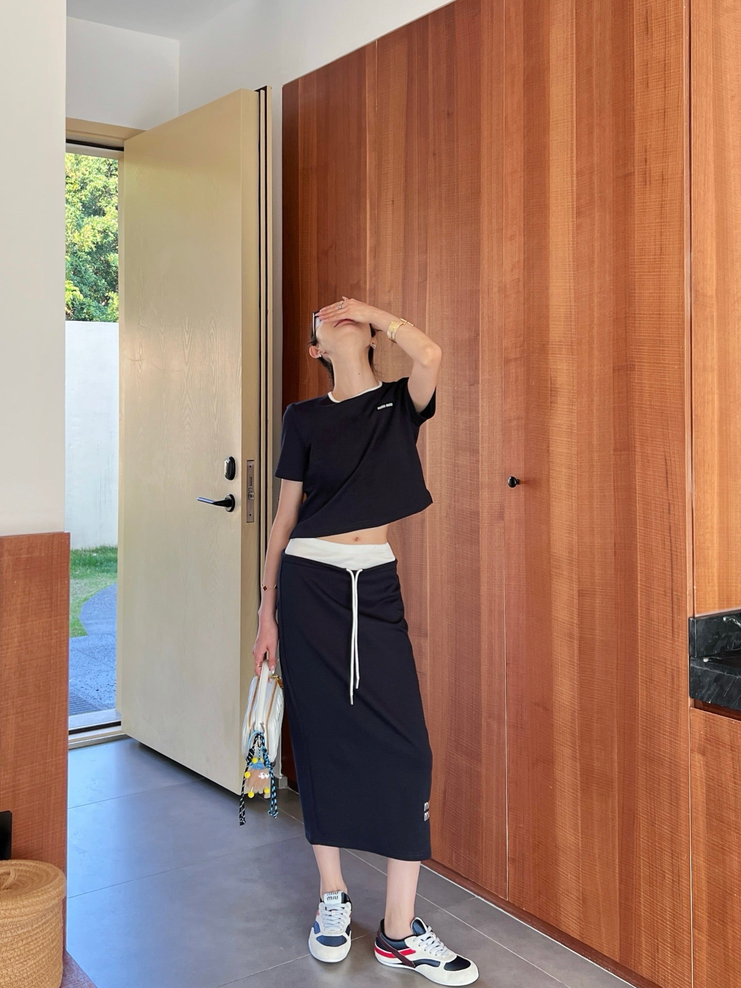 Short contrast color T-shirt + fake two-piece elastic waist mid-length skirt