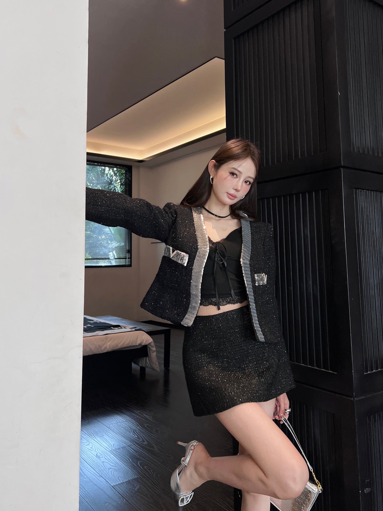 Valen* 25ss sequins embroidered tweed crop jacket