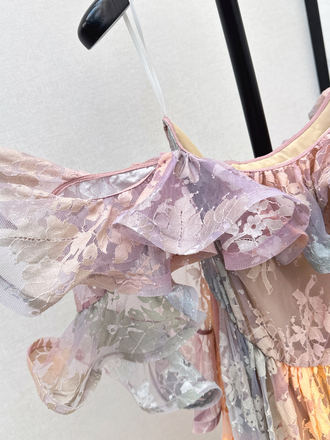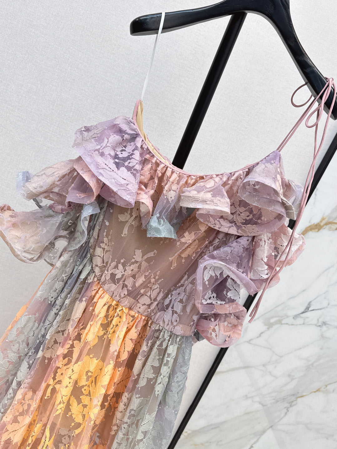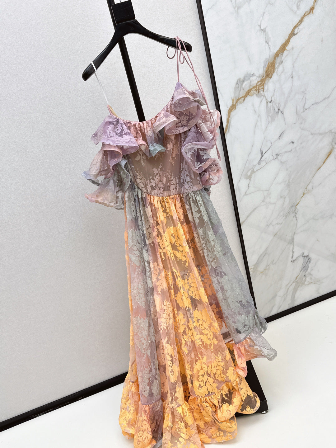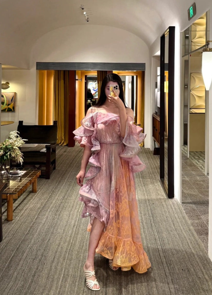 Zim* 25ss Asymmetric ruffled lace midi dress