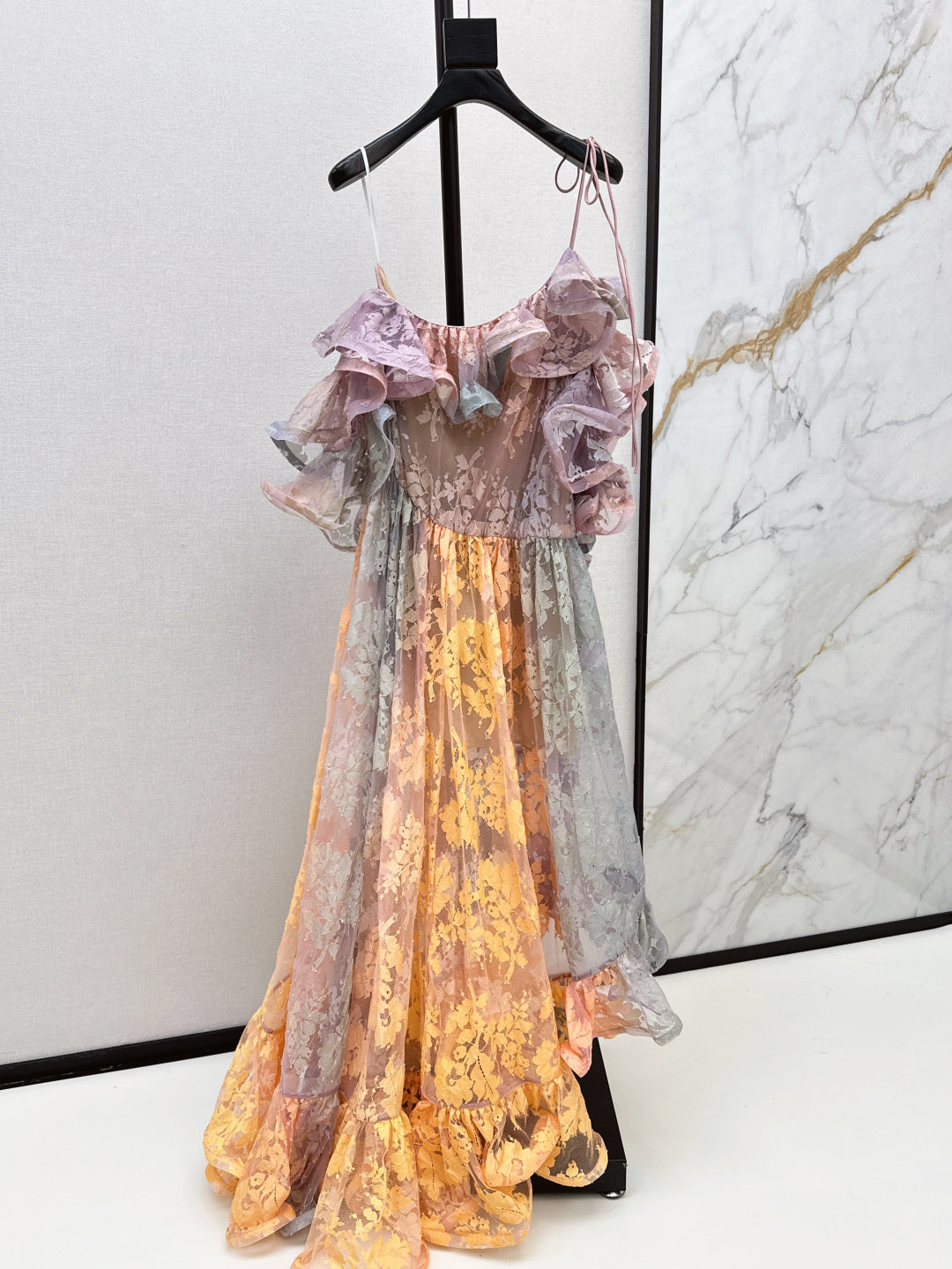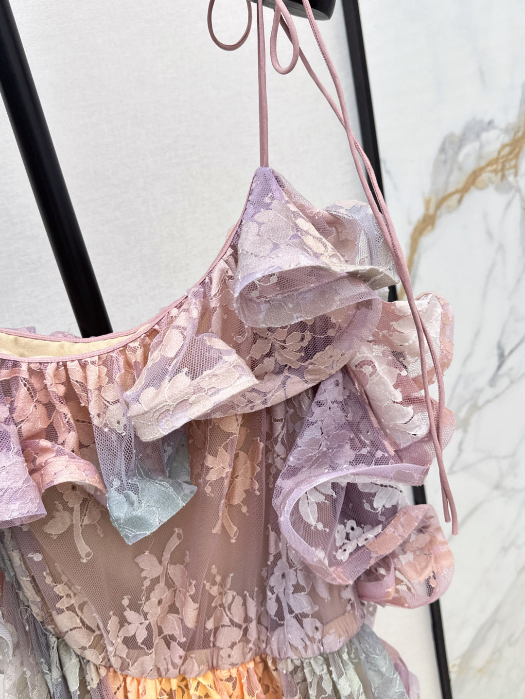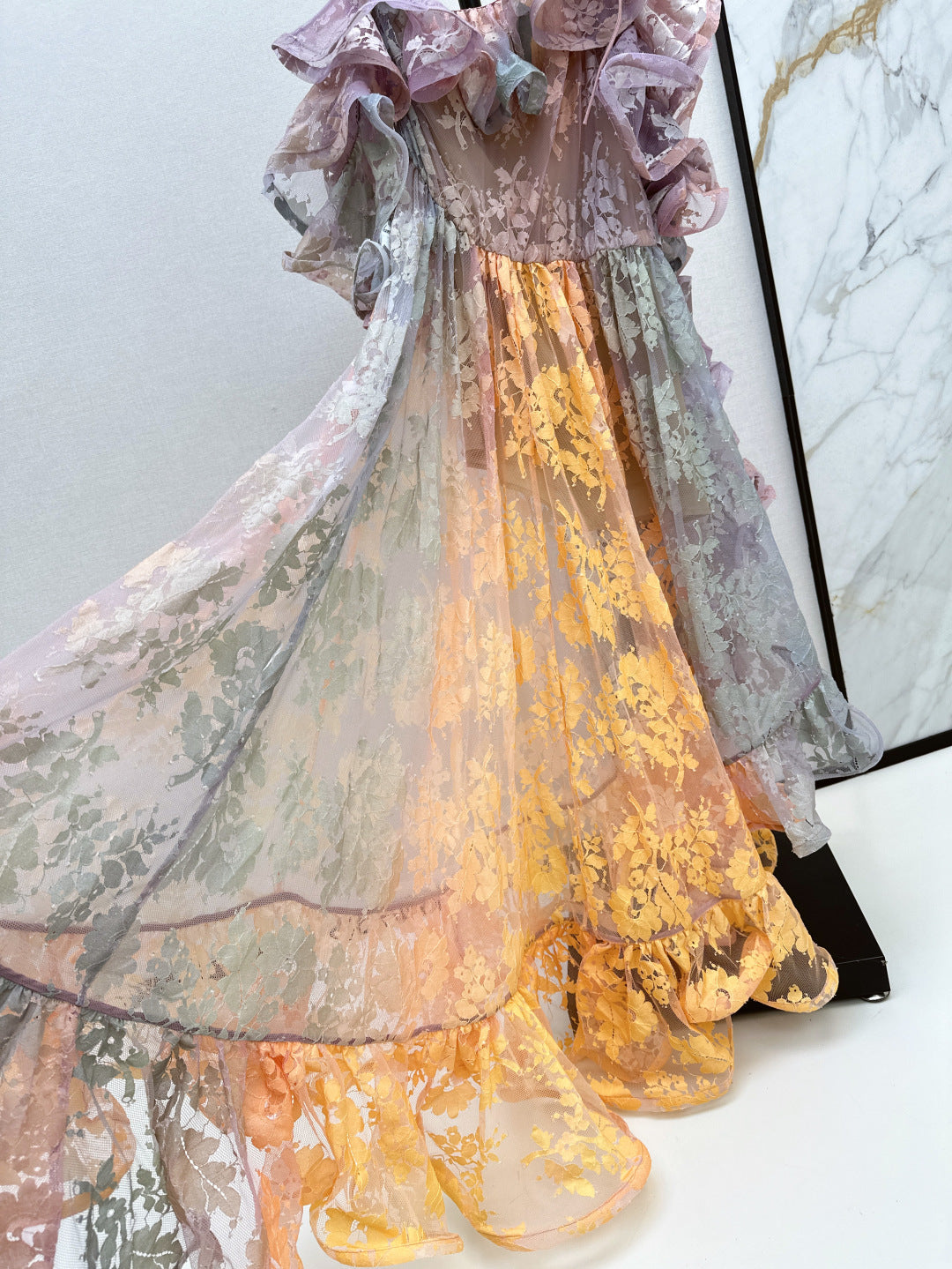 Zim* 25ss Asymmetric ruffled lace midi dress